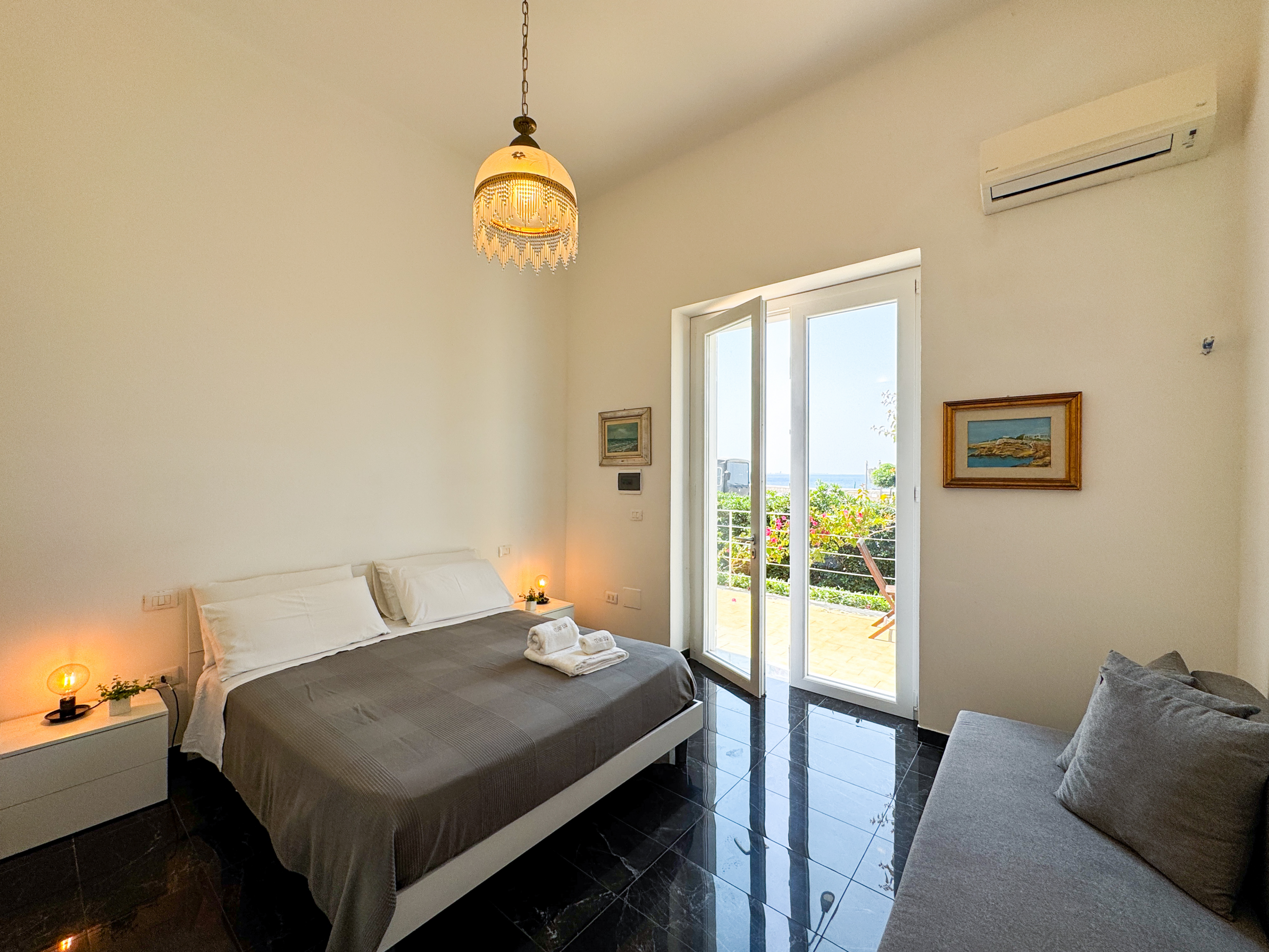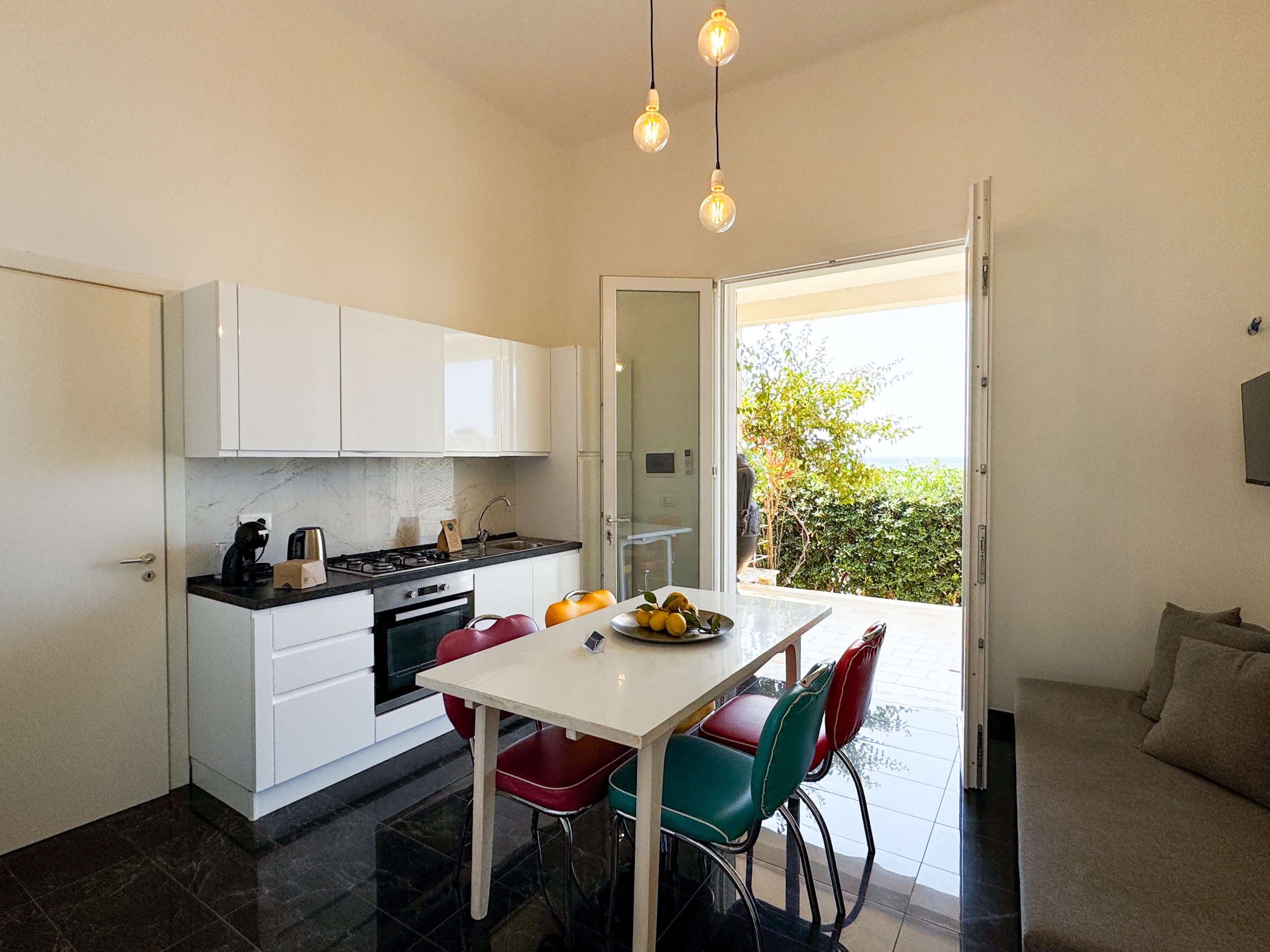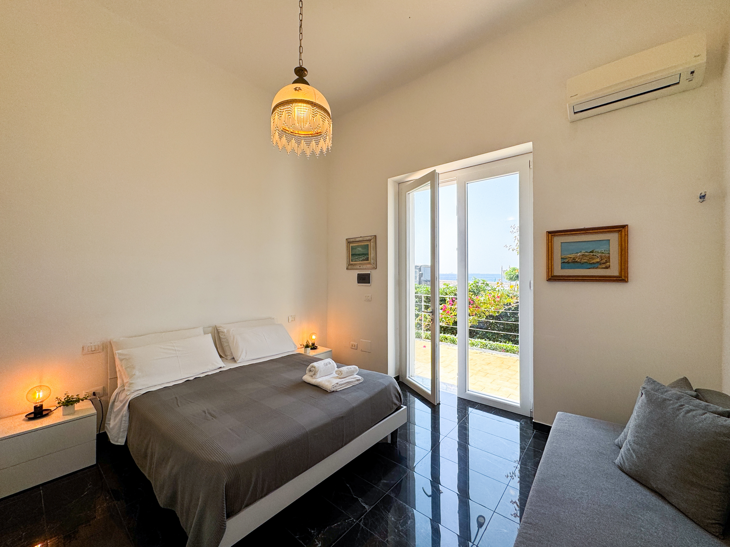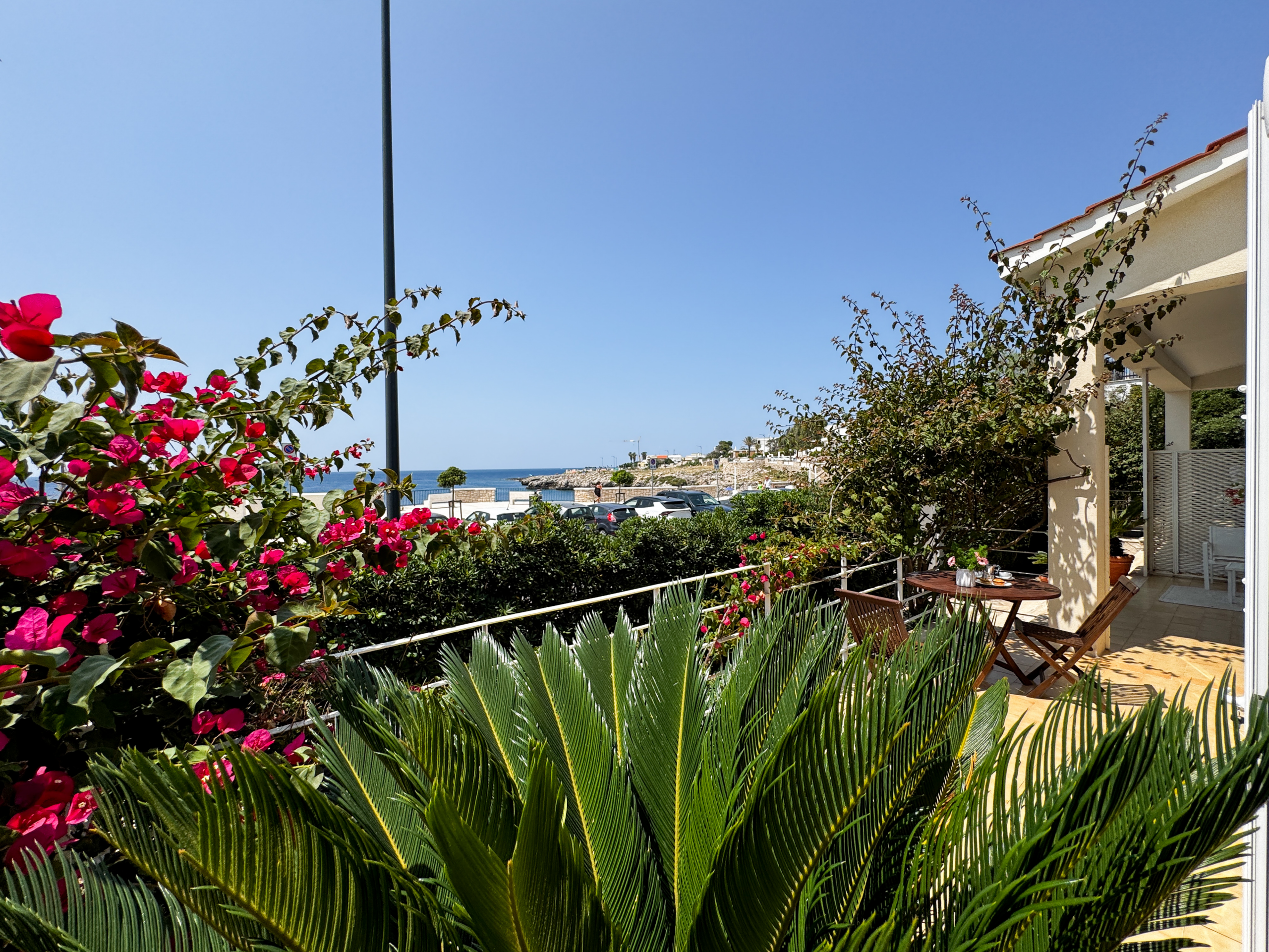 L'unità abitativa, collocata all'interno di una bellissima e antica villa a soli dieci metri dal mare, è composta da ampia cucina abitabile con vista mare e divano letto, camera matrimoniale con ampia vetrata vista mare, bagno completo di doccia, giardino interno con doccia e veranda panoramica sulla baia di Gallipoli.
